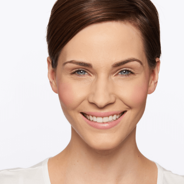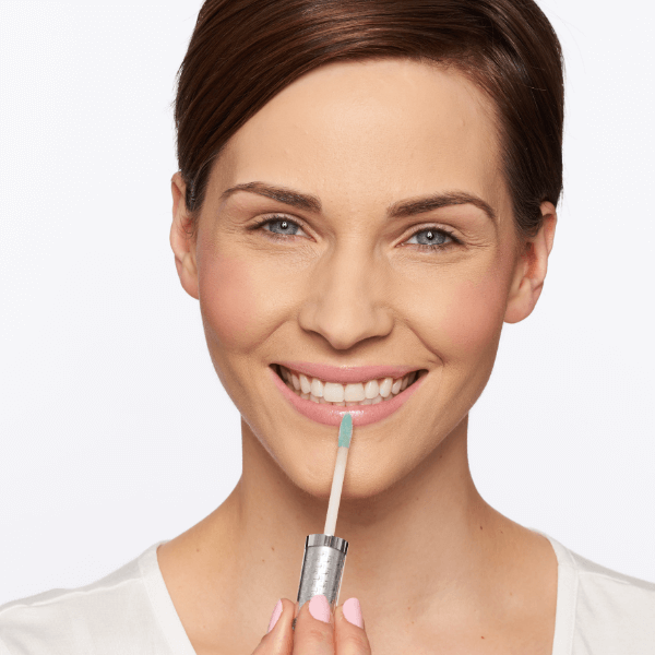 Apply a small amount onto lips and finish with Vitality Lip Flush Lip-Softening Smooth Butter Gloss in News Anchor Blue for a soft pink lip that creates the look of a whiter, brighter smile.