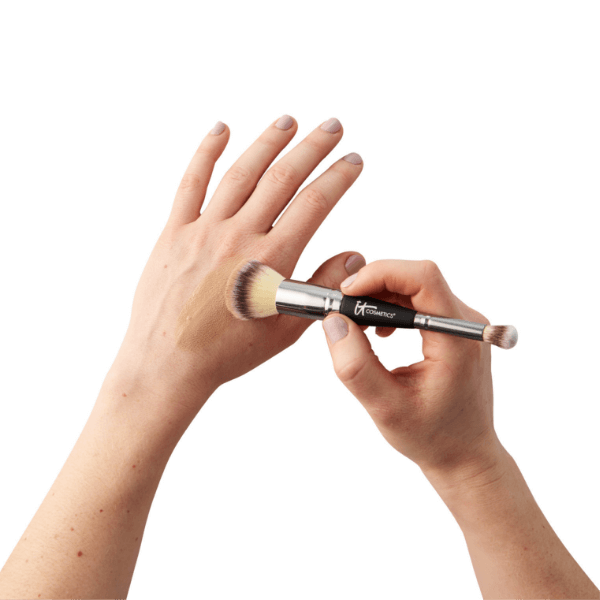 Using your favorite IT Cosmetics brush, buff onto skin. Speak to SPF 50 protection and how a little goes a long way.