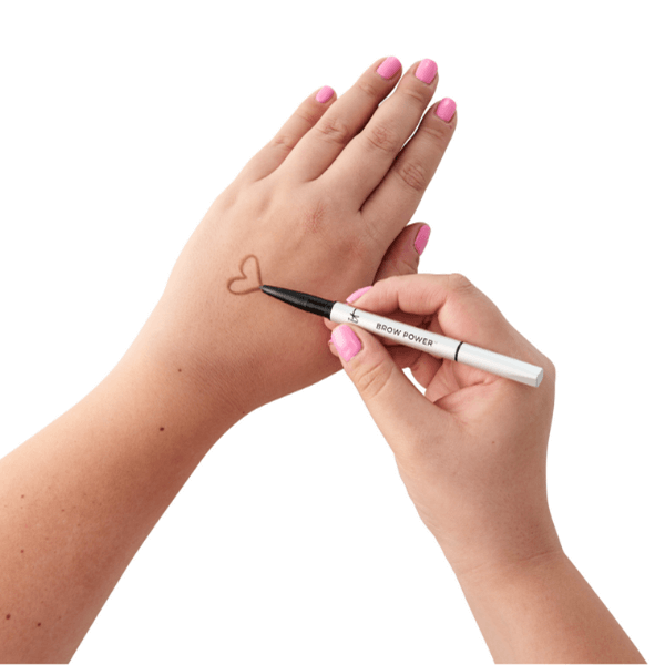 Use Brow Power pencil to draw heart on hand and spritz with water.