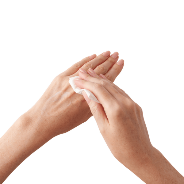 Spray hand with water to rinse, and speak to lack of leftover residue and how smooth skin feels.